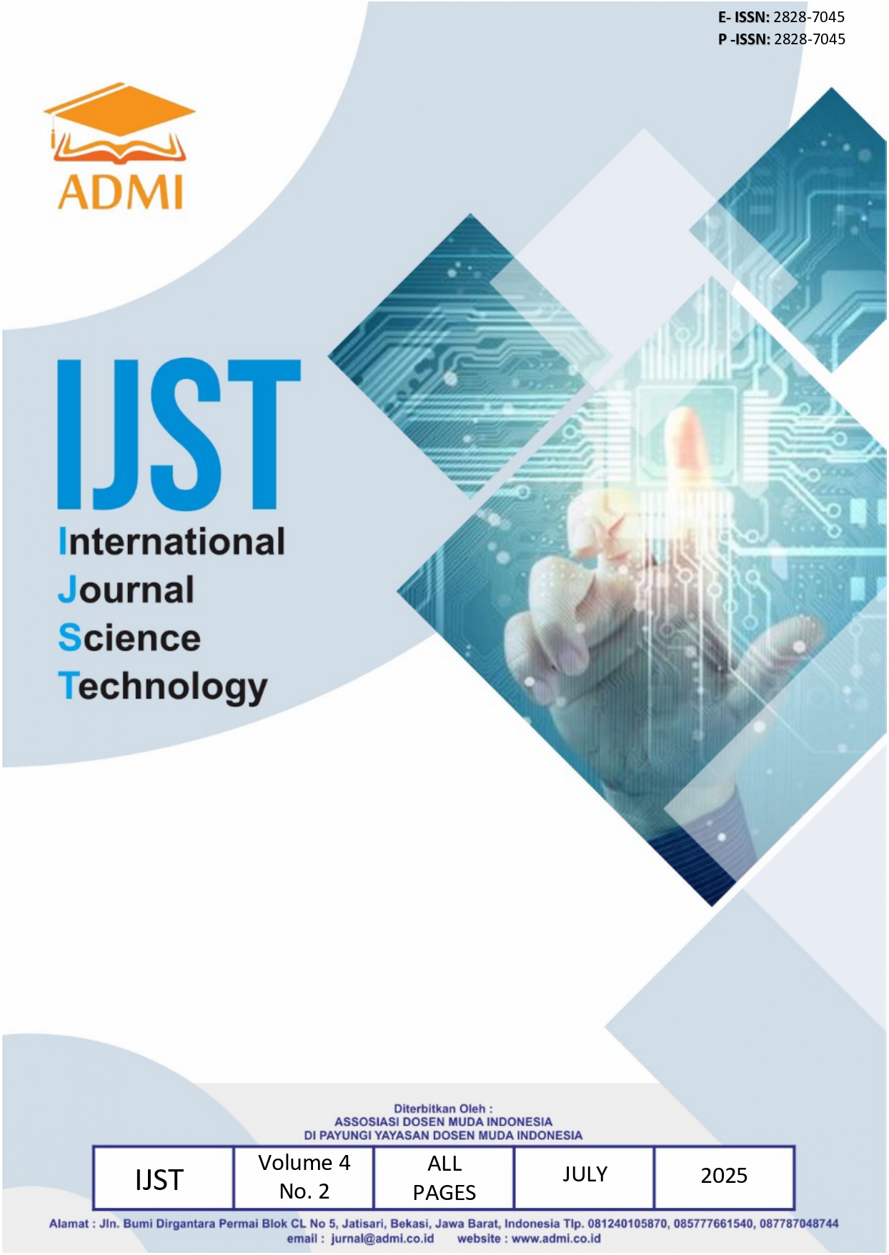 Vol. 4 No. 3 (2025)International Journal Science and Technology (IJST): ISSN: 2828-7223 (print), ISSN: 2828-7045 (online) is a scientific journal that presents original articles about research knowledge and information or the latest research and development applications in the field of technology. The scope of the IJST Journal covers the fields of Informatics, Mechanical Engineering, Electrical Engineering, Information Systems and Industrial Engineering. This journal is a means of publication and a place to share research and development work in the field of technology. Articles published in this journal are addressed to the editor's office. Complete information for article loading and article writing instructions are available in each issue. Articles submitted will go through a selection process for bestari partners and/or editors. Journal of Journal of Engineering, Electrical and Informaticsis published 3 times a year, namely in March, July and November.