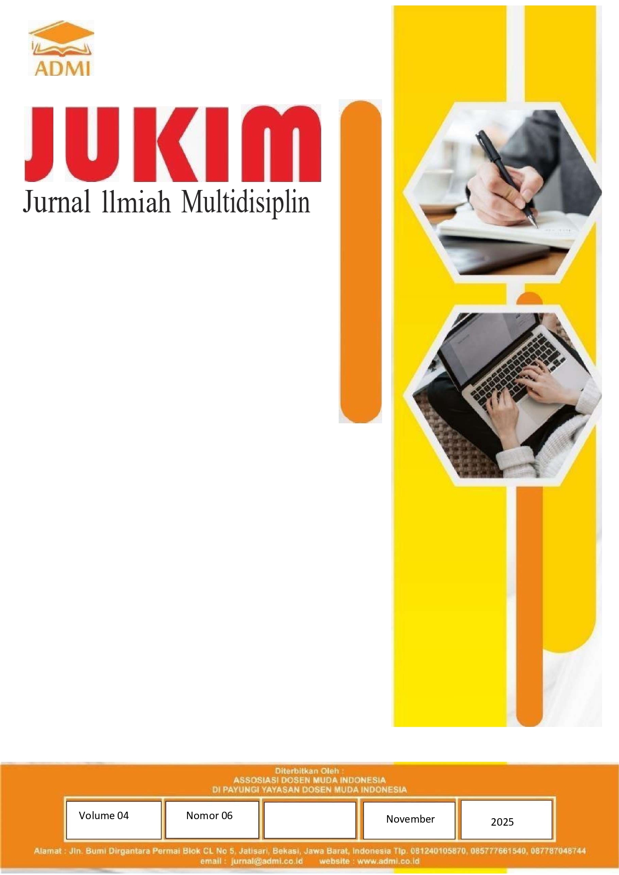 Vol. 4 No. 6 (2025)Jurnal Ilmiah Multidisiplin (JUKIM) ISSN: 2829-0488 (cetak), ISSN: 2829-0518 (online) adalah jurnal yang ditujukan untuk publikasi artikel ilmiah yang diterbitkan oleh Asosiasi Dosen Muda Indonesia dan di payungi Oleh Yayasan Dosen Muda Indonesia, saat ini sudah terakreditasi SINTA 5 Sampai 2027 sesuai dengan keputusan Direktur Jendral Pendidikan Tinggi, Riset dan Teknologi Nomer 10/C/C3/DT.05.00/2025. di terbitkan 6 kali dalam setahun yautu Januari, Maret, Mei, Juli, September, November. Jurnal Ilmiah Multidisiplin sebagai sebuah jurnal ilmiah diharapkan dapat menunjukkan kepada masyarakat luas akan kekayaan khazanah keilmuan melingkupi berbagai dimensi kehidupan. Ruang lingkup dan fokus terkait dengan penelitian dengan pendekatan Multidisipliner, yang meliputi: Ilmu Ekonomi dan Bisnis, Humaniora, Ilmu Sosial, Komunikasi, Teknik, dan Informatik.